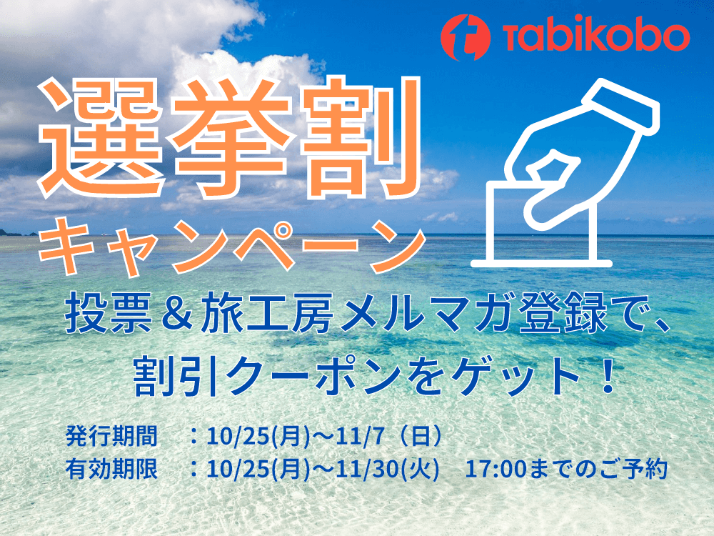 ・対象ツアーはコンシェルジュ予約のみ ・事前にフォームで選挙で投票をしたにチェックを入れていただき、メールアドレスを登録する。 ・アドレスは旅工房のメールマガジンに登録される。 ・登録したメールアドレスで、割引したいツアーに申込をする。 ・申込時に備考欄でセンキョ割の利用を希望する旨をご記載いただく(自動では割り引かれません。クーポン使用にあたり、申告が必要です。)
